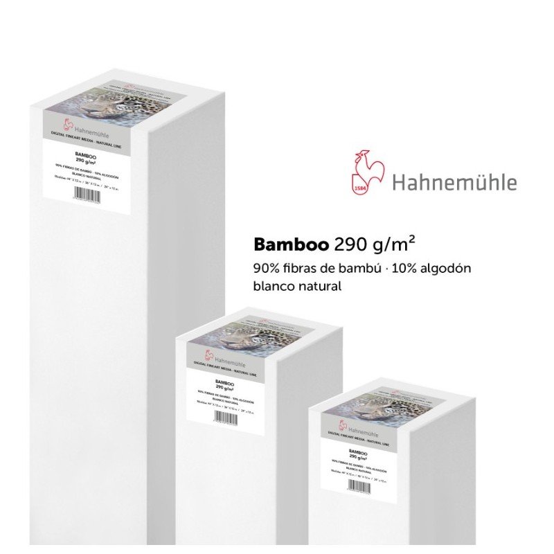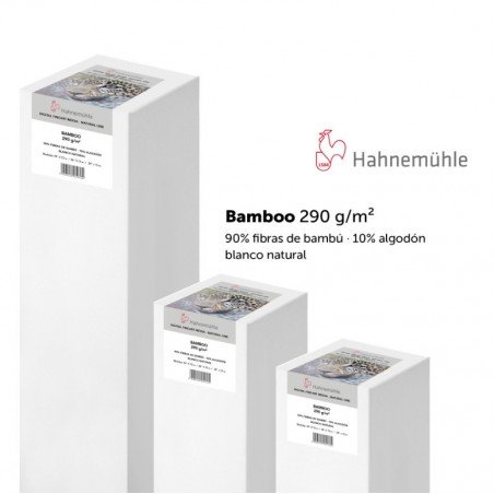 Bamboo de Hahnemühle es el primer papel FineArt Inkjet del mundo elaborado a partir de un 90% de fibras de bambú, y representa para la industria del papel, el respeto a la naturaleza y al medioambiente. El papel de bambú de tono cálido blanco natural no contiene blanqueadores ópticos y destaca por su estructura de fieltro suave, ligeramente texturizada con una agradable sensación al tacto. El recubrimiento premium mate inkjet proporciona resultados de impresión excelentes con una fina reproducción de detalles y colores, sobre todo, hace resplandecer las impresiones monocromas y de colores cálidos. Bamboo no contiene ácidos ni lignina y cumple con los requisitos más rigurosos de resistencia al envejecimiento. Esta excepcional combinación de fibras de bambú, de producción sostenible, superficie de textura suave y convincente calidad de impresión confiere sensualidad y alma a cada obra de arte.
